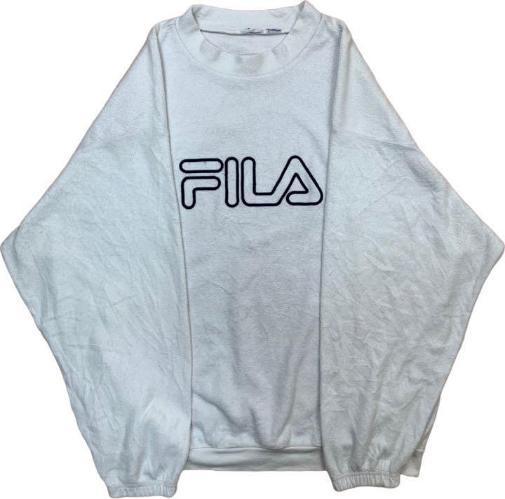 - 古着 FIRA フィラ スウェット ホワイト 白 トレーナー デカロゴ パイル ビッグサイズ ビッグシルエット