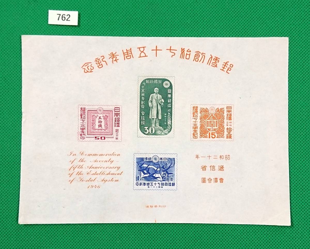 - 郵便創始75年記念/収/小型シート/NH/美品/1946年発行/戦後初販売切手4種の小型シート/希少/昭和レトロ/カタログ価格28,000円/№762