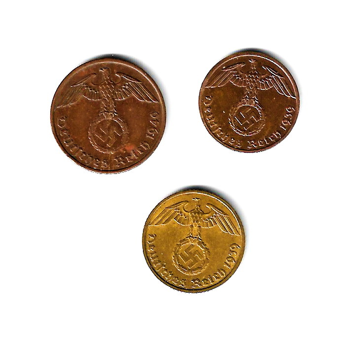 - ドイツ第三帝国 (鉤十字) - 1, 2, 5 ライヒスペニヒ/青銅貨 黄銅貨★ZD-25