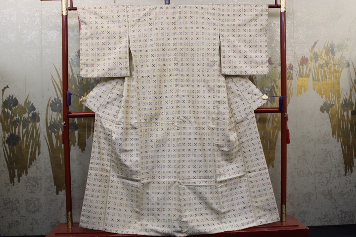 - きもの今昔6179 紬のきもの 広衿袷仕立て 十日町紬 クリームアイボリー地 緑赤茶の色絣 未使用に近い 身丈155㎝