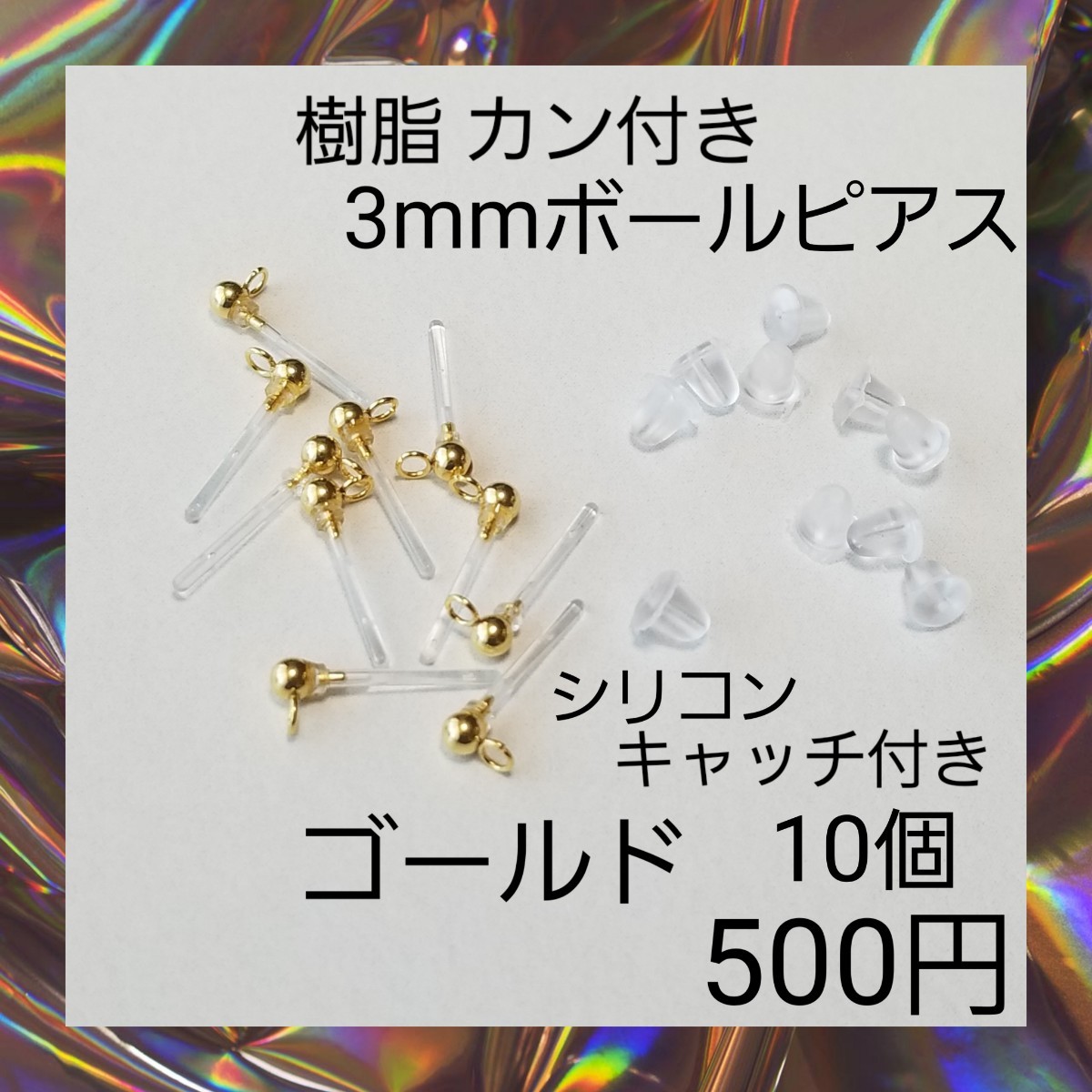 - 金属アレルギー対応 カン付き 樹脂 3mmボール ピアス ゴールド パーツ 01