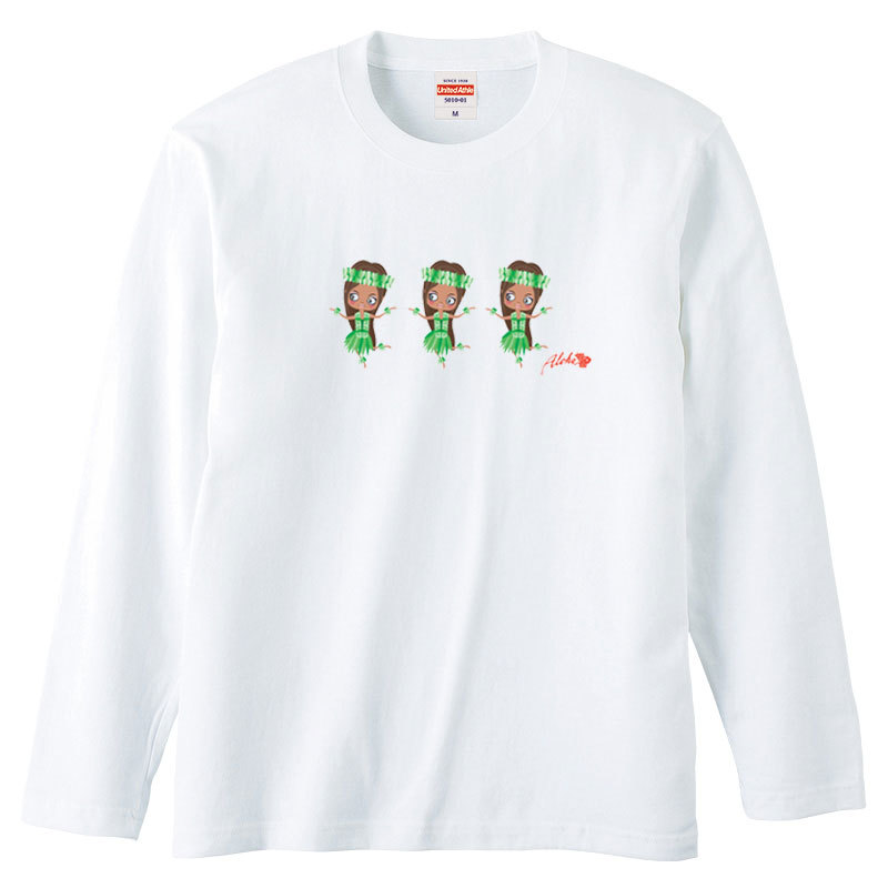 > レディースM対応(タグ表記男女兼用S)/ホワイト*キュートな3人フラガール&モンステラ*長袖/Tシャツ/フラダンス/ハワイ/送料無料【tl019】