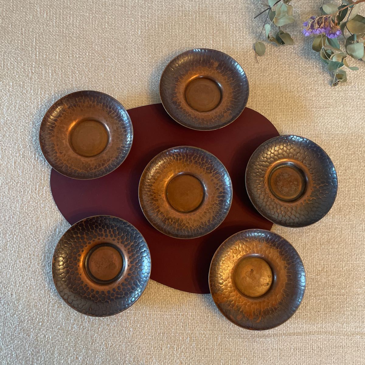 - 煎茶道具 英純堂造 茶托 六客 時代物 アンティーク 鎚 銅器 銅 金属工芸 純銅 食器 皿 インテリア 6枚セット アクセサリー トレー
