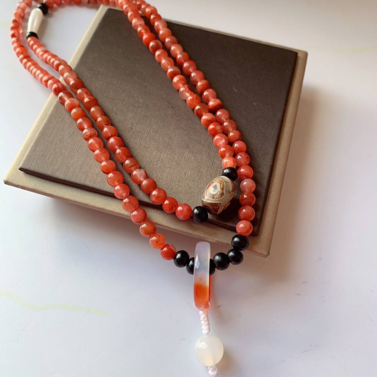 - ◇南紅瑪瑙+白蝶貝(しろちょうがい)+瑪瑙+三目天珠+黒檀木◇ネックレス◇パワーストーン◇巾着袋付き◇プレゼントにも010P122509