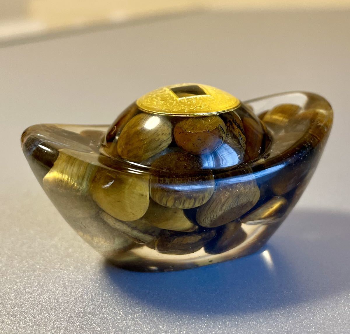 - 元宝のオルゴナイト タイガーアイ 天然石 パワーストーン 置物インテリア 銀錠 風水晶 魔除 お守 金運 財運 幸運 ラッキー