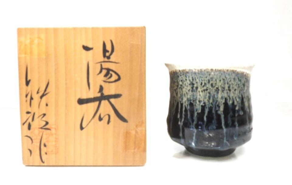 - 黒釉に流れる釉景が見事な逸品! 昭和期ビンテージ 唐津焼 白釉流紋湯呑 在銘品 在銘は一矢 木箱 1980年代 KEN512