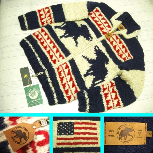 ★★★本体タグ・・・Wネーム限定仕様の、本革の刻印入りのタグ有り(ハンティングワールド刻印、100%WOOL。HandKnit in Canada 刻印有り。