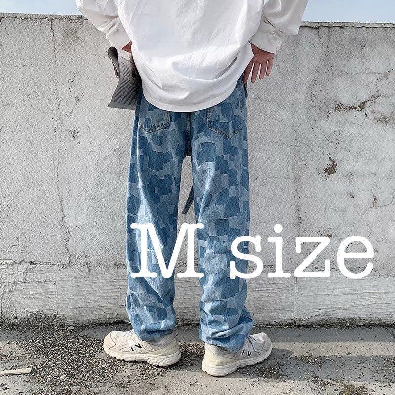 - デニム ワイドレッグ ストレートパンツ ジーンズ パッチワーク風 ユニセックス M