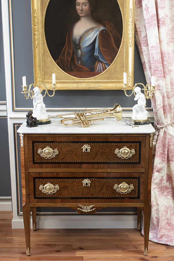 ルイ16世様式の可憐な要素ももちろんあり、鍵穴やハンドルのブロンズにはリボンが使われ、まっすぐの脚もすっきりとしています。