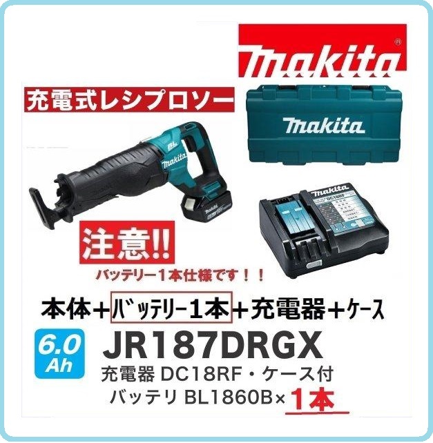 > マキタ 18V 充電式レシプロソー JR187DZ 本体+6.0Ahバッテリ(BL1860B)×1+充電器(DC18RF)+ケース 【JR187DRGX (バッテリー1本仕様)】●