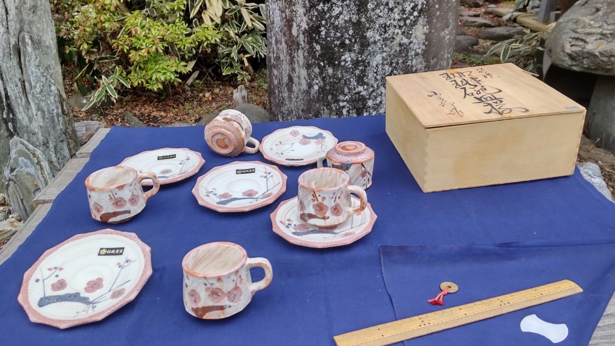 - 桔梗屋窯 志野珈琲碗皿揃 梅文 共箱