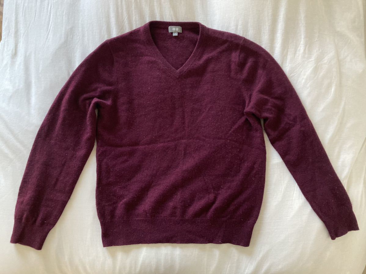 - ユニクロ カシミア 100% ワインレッド M メンズ Vネック ボルドー