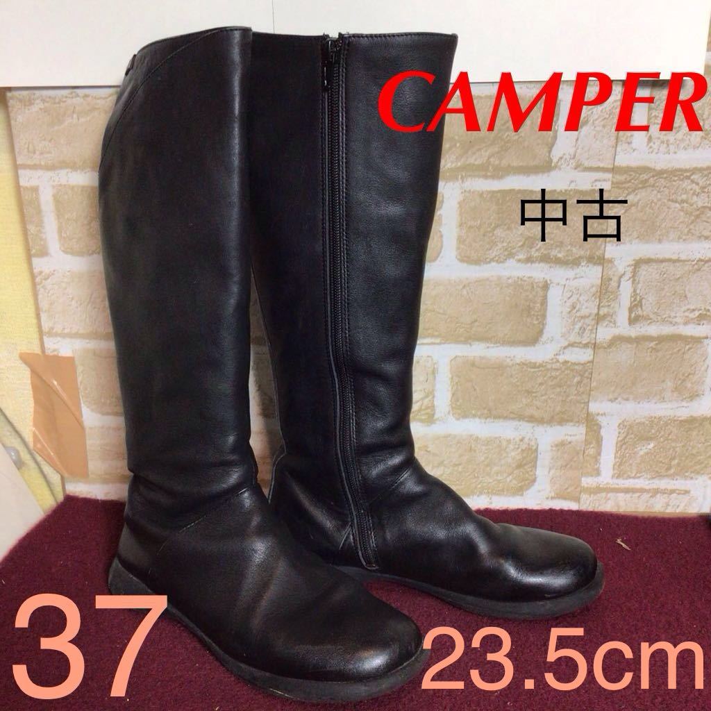 - 【売り切り!送料無料!】A-346 CAMPER!ロングブーツ!黒!ブラック!37 23.5cm位!サイドジップ!ぺたんこ!中古!