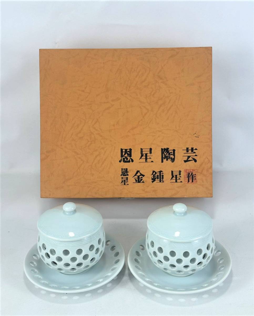 - E412●長期保管品●金鐘星(恩星)【青磁網目茶碗、皿セット】2客 透かし花瓶 / 高麗青磁 煎茶道具 茶器 茶道具 民族工芸 陶器 現状品