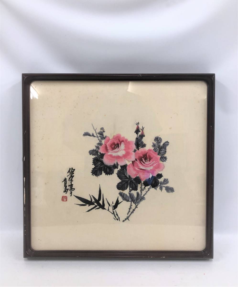 - ●X126●伯尋?【富貴牡丹図】刺繍 花鳥画 青島 中国美術 額装 在銘 落款 サイズ:約46.2㎝ x 45㎝