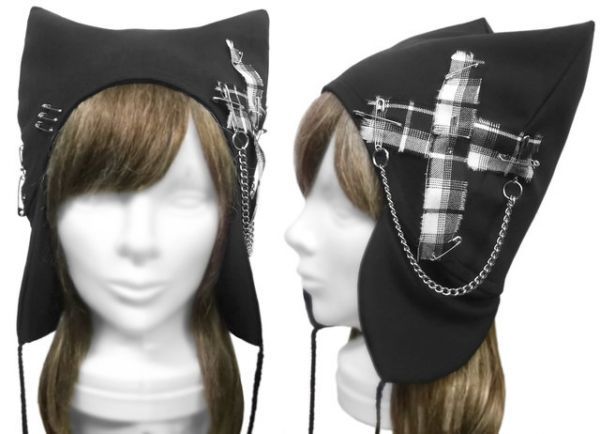 > ☆ハロウィン☆ ◇送料無料◇ ハンドメイド◆パンク[チェッククロス飾り&チェーン付] 耳あて付 猫耳帽子◆コットンニット/ブラック