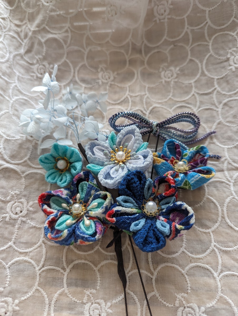 - 髪飾り5点☆ 青・水色系☆和装☆ ハンドメイド☆ちりめん細工☆つまみ細工☆七五三・成人式・卒業式☆和小物☆送料込み