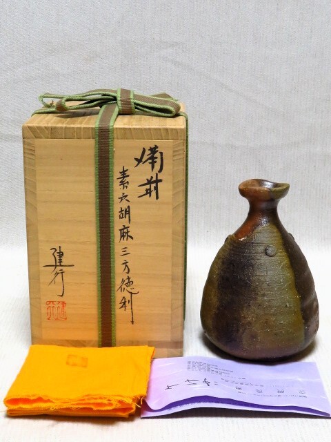 - 備前徳利 素六胡麻三方徳利 乗松建行 共箱 共布 栞 酒器