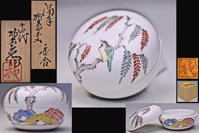 > 酒井田柿右衛門 14代 ★ 濁手 柳鳥文 香合 ★ 共箱 共布 ★ 本人作 ★ 上作 ★ 色絵 ★ 香道具 ★ 茶道具 ★ 趣ある逸品