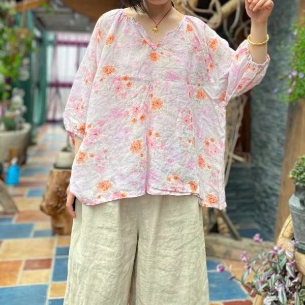 - lgn 1538チュニック Vネック 花柄 アンティーク風 洋服ミックス ロマンファッション ポップ 楽ちん 麻100% リネン 薄いピンク