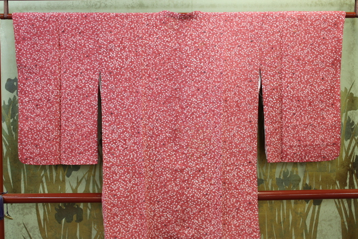 - きもの今昔6695 道行きコートコレクション 正絹一越生地 赤蘇芳色のむら濃淡ぼかし地に小花模様 身丈90cm