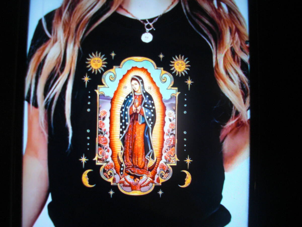 - マリア様プリント半袖Tシャツ(黒/M)レディス・マリア/太陽/月/チカーナ・メキシカン・ローライダー・ギャングスタ