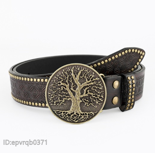 > ベルト◆新品 メンズ レザーベルト ピンバックル式 金属バックル 木 バックル 柄物 革ベルト リベット 長さ調整可能 ポンチ付き /茶色