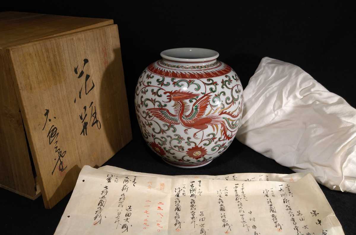 > 九谷焼 「花瓶」 金彩 色絵 唐草文 鳳凰図 花瓶 共箱 華道具 茶道具 a-36k665