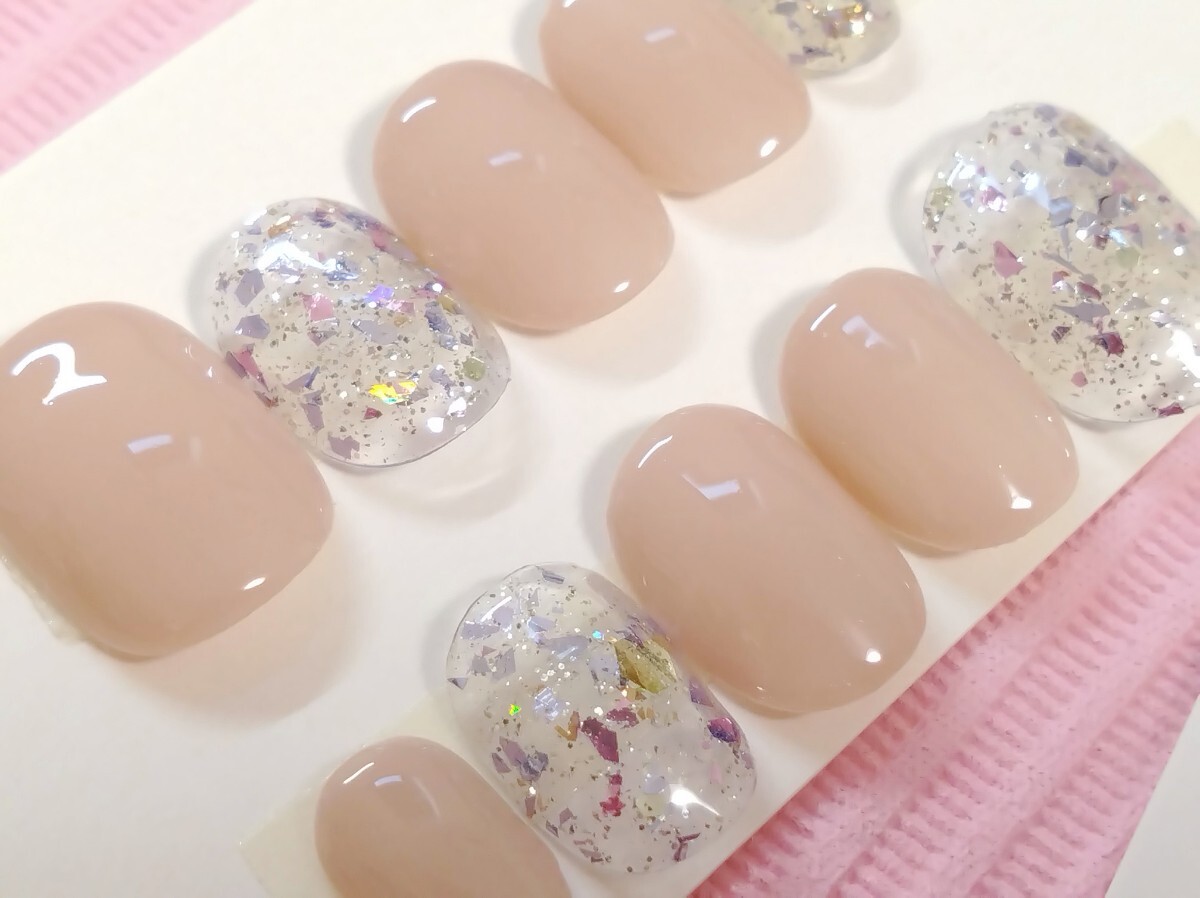 - 【ジェルネイル】Mサイズベリーショート・くすみピンクベージュ×ラメネイルチップシンプルネイルチップ付け爪・19