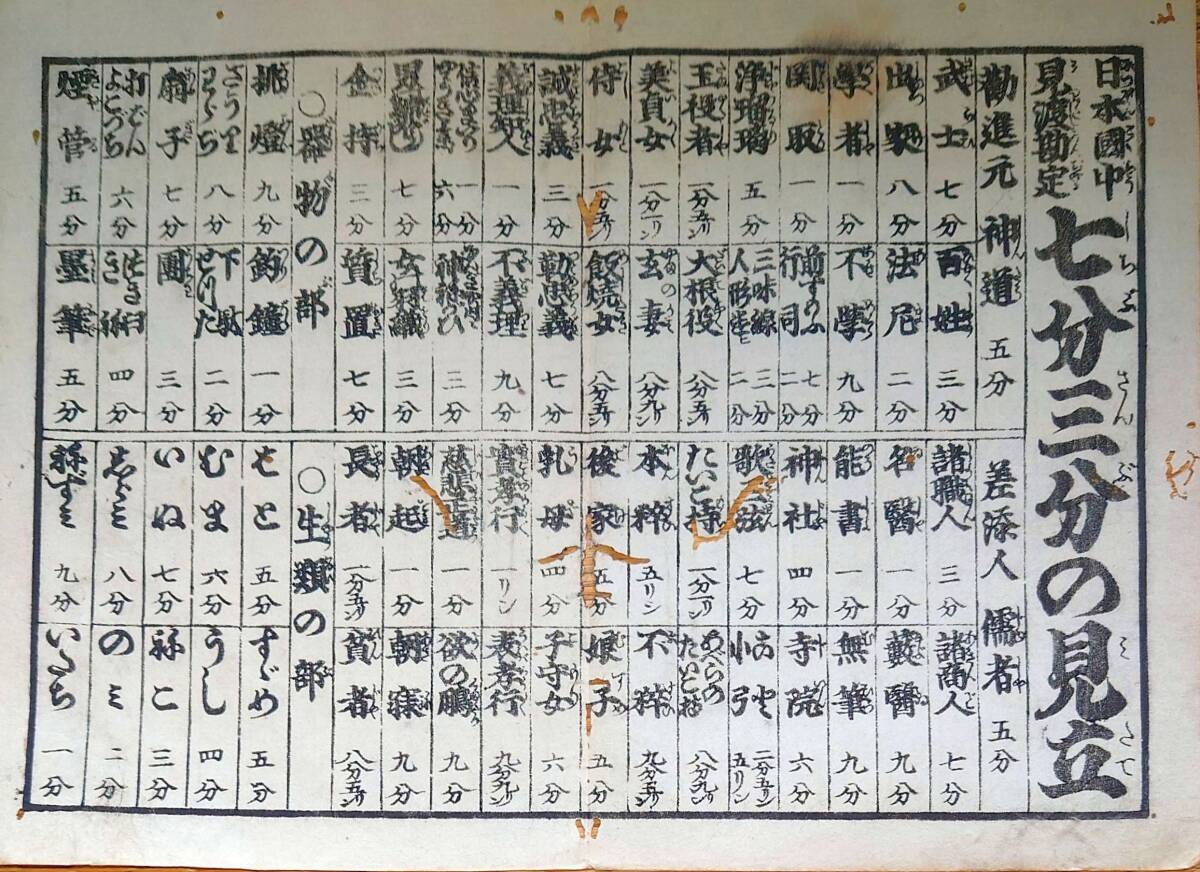 > f240409105〇一枚刷り 浪花みやげ初編 日本国中見渡勘定 七分三分の見立 ことば遊び しゃれ なぞ 判じ絵 見立番付 天保年間 塩屋喜兵衛板