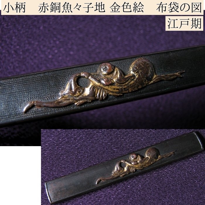 - 時代武具 小柄 赤銅魚々子地金色絵 布袋の図 桐箱付 江戸時代/24d007