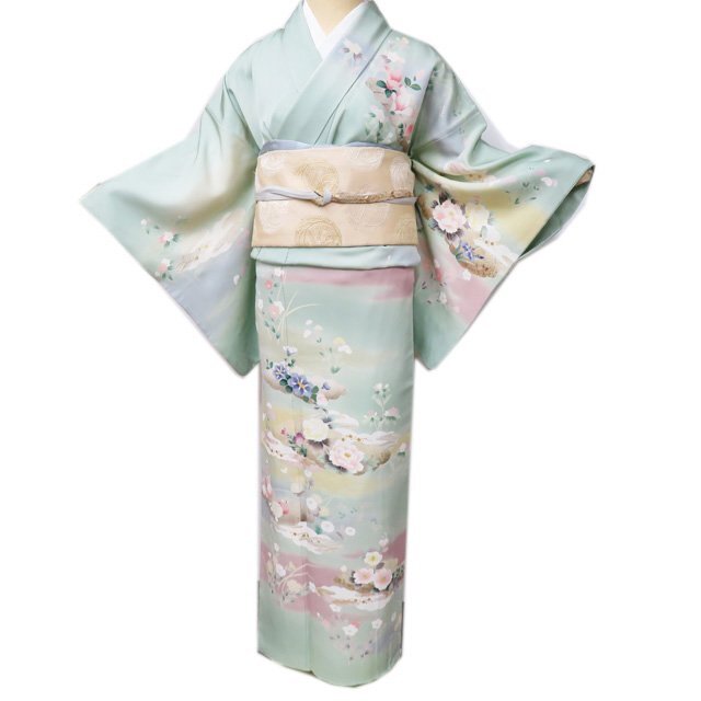 - 訪問着 着物 中古 正絹 袷 フォーマル 花の図 秋草 雲 霞 暈し 薄緑色 多色 金 身丈153.5cm 裄65cm SA ワイド きもの北條 A1001-9