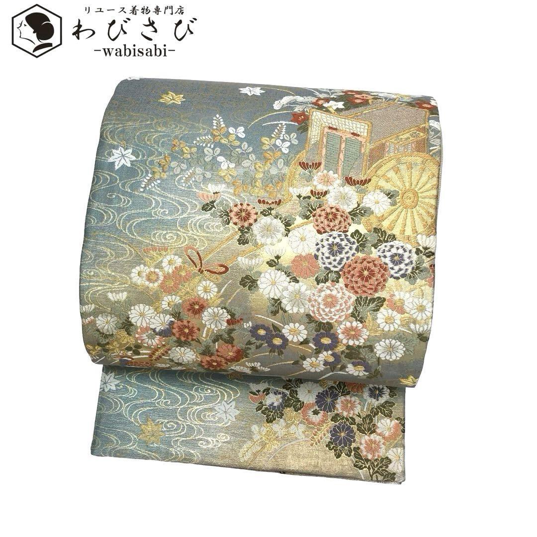 - 袋帯 リバーシブル 曲水源氏車文 鏡裏華文 美しい花模様 鴛鴦 O-3545