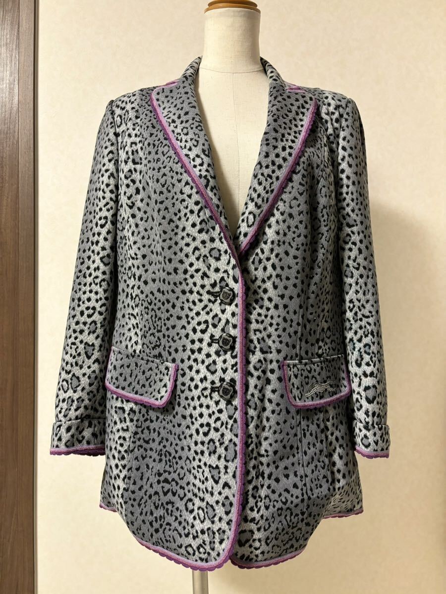 > ■ 伊太利屋 GK ITALIYA 日本製 長袖 グレー ヒョウ柄 ジャケット ブレザー 婦人服 トップス 13号 XLサイズ 42 イタリヤ ピンクパープル 瓢