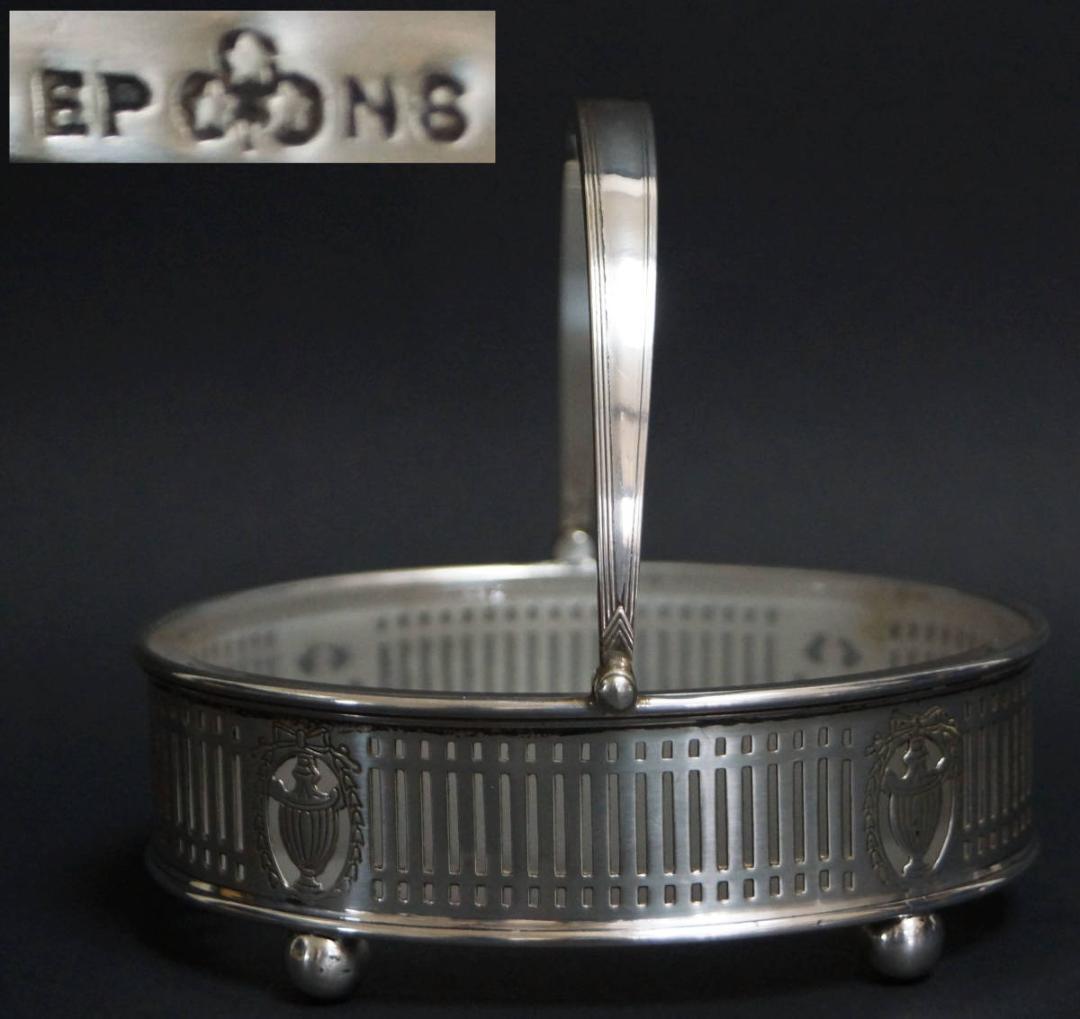 > 【閑】イギリス 銀メッキ バスケット型 アクセサリー入 小物入 金工細工 透かし彫り 内ガラス付 アンティーク 四つ足☆時代物☆C1113