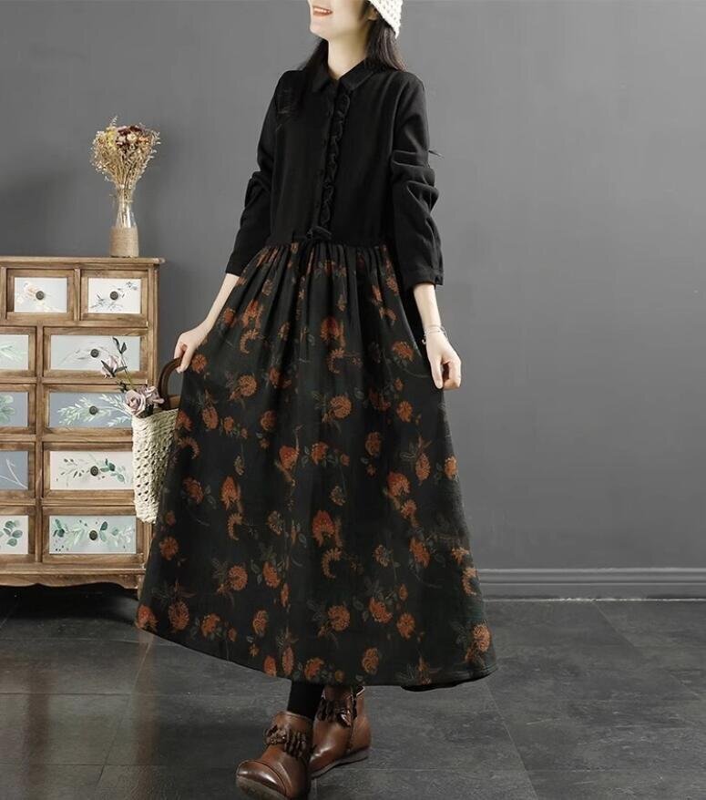 - ワンピース ロングワンピース 長袖 春 秋 ロング丈 マキシワンピース きれいめ ゆったり 大きいサイズ Aライン 復古風 ブラックK0225