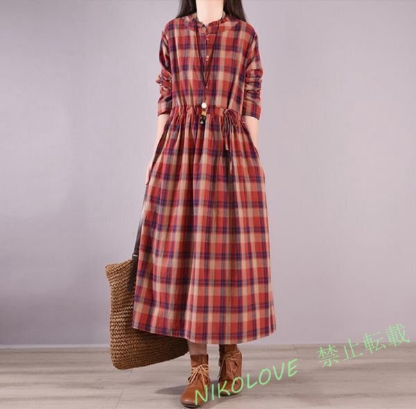 - LB971 春 カジュアル ゆったり 20304050代 チェック柄 綿麻 大きいサイズ おしゃれ 長袖 ロングワンピース 赤 /XLサイズ