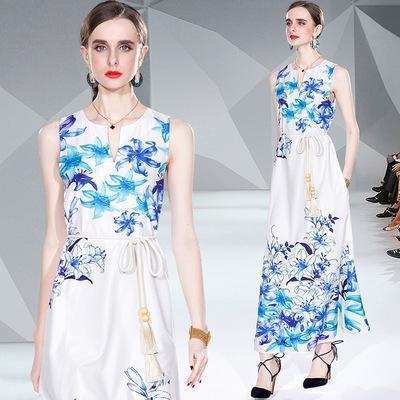 - 【ホワイト&ブルー花柄★L】ロング ワンピースベルト付きレディース人気