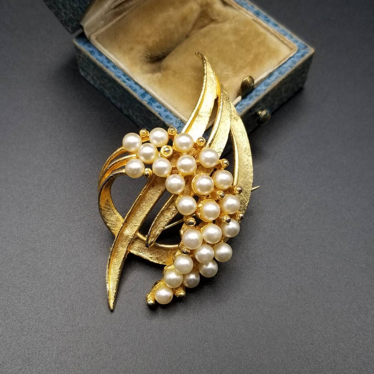 > リーフ 葉っぱ モチーフ ホワイト フェイク パール エレガント 上品 ゴールドトーン ヴィンテージ ブローチ ジュエリー 輸入 Y15-Q
