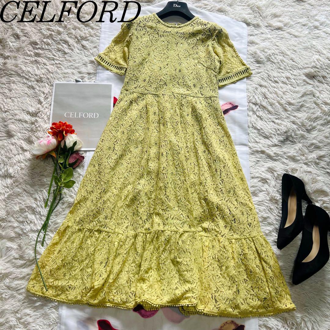 - 【美品】CELFORD ロングワンピース レース イエローグリーン 半袖 セルフォード