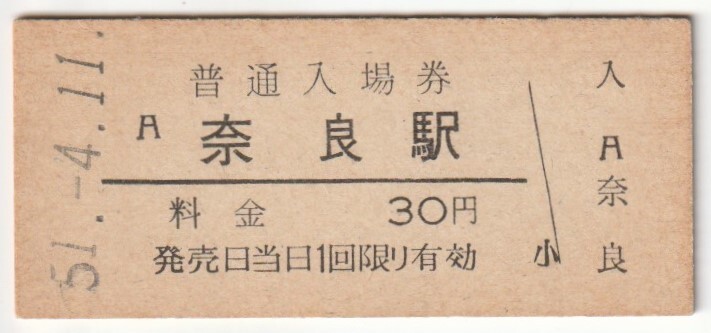 - 昭和51年4月11日 関西本線 奈良駅 30円硬券普通入場券
