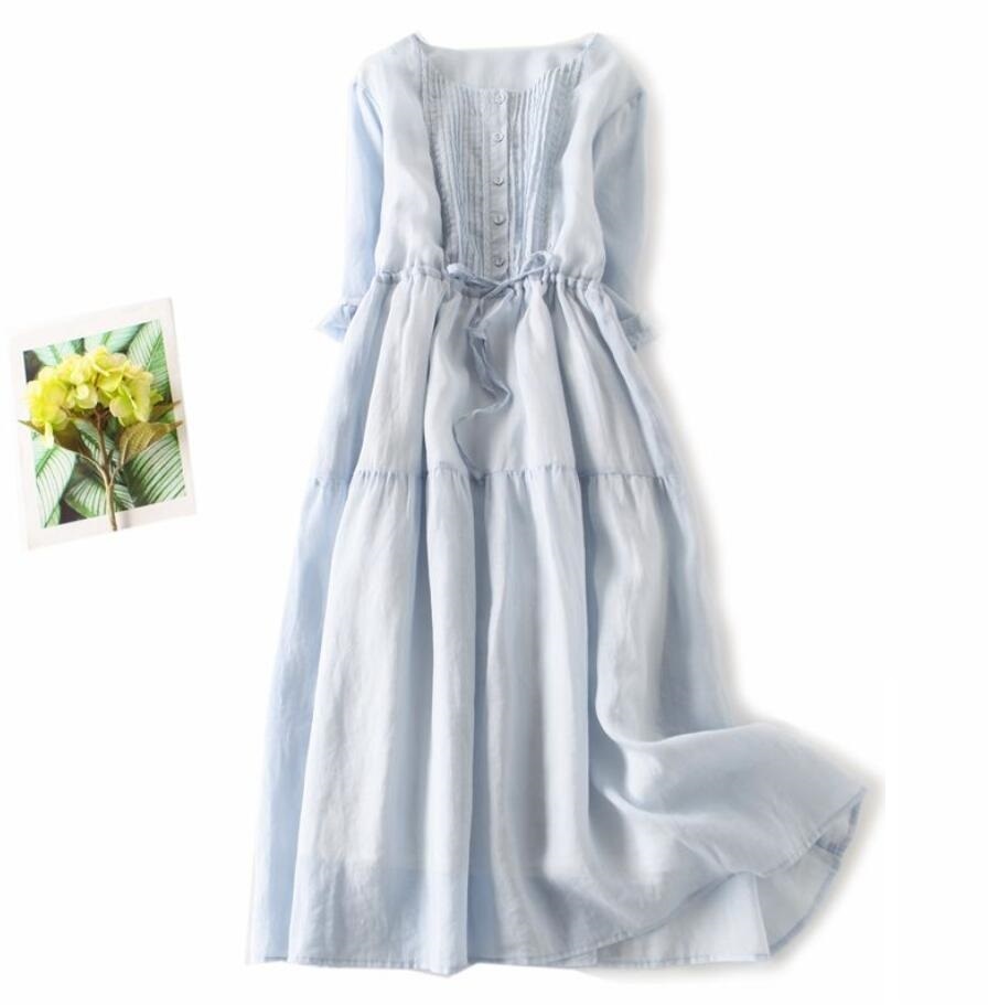 - 夏新品*ロングワンピース ワンピース 半袖 きれいめ リネン ワンピース 半袖 おしゃれ 大きめサイズ 入園式 大人 上品 OL オフィス*水色