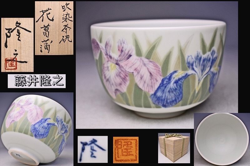 > 藤井隆之 ★ 吹染茶碗 『花菖蒲』 ★ 共箱共布栞 ★ マットな質感 ★ 釉下彩タイプ ★ 東京芸大出身 ★ あやめ ★ 茶道具