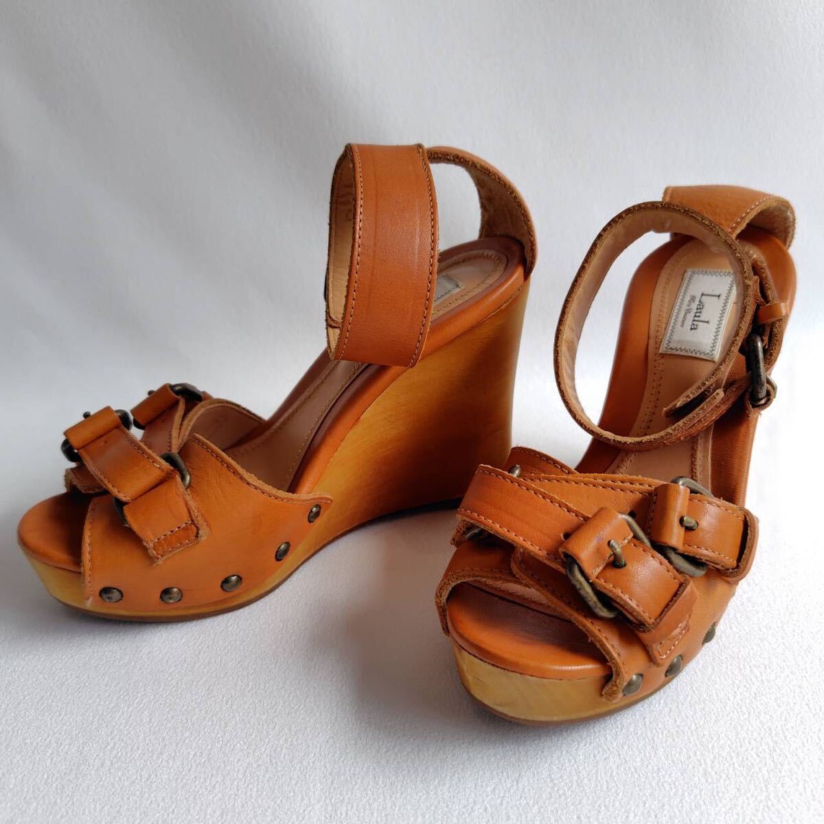 > 日本製 36 約23.0cm Laula ラウラ レザーサンダル ブラウン 茶 オレンジ ハイヒール ウェッジヒール ベルト No.7 ハイヒール 22.5 23.5