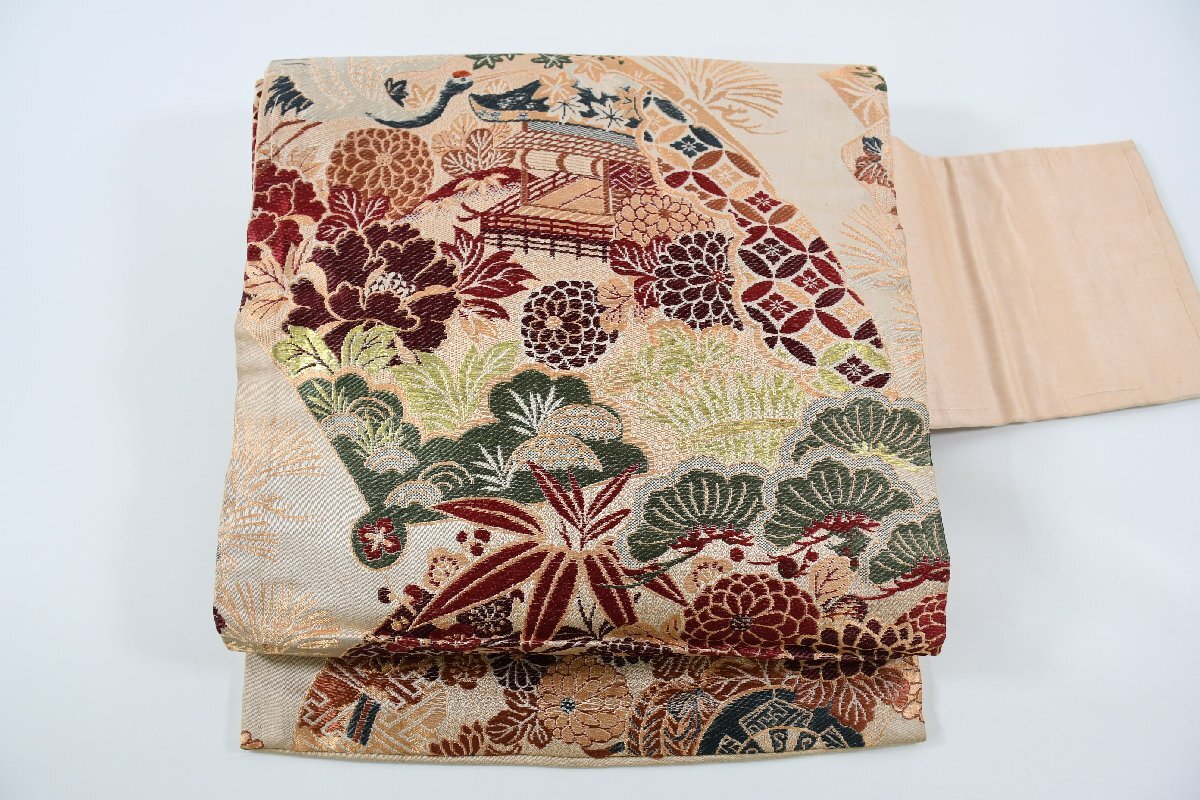 > 名古屋帯 アンティーク 扇面 風景 花 帯丈337cm ★着物屋 ne-9985 桜庭呉服店