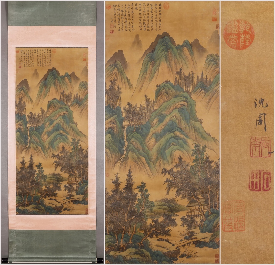 - 古美術 掛け軸 中国・明時代 「沈周書」 絹本 【山林麓隠図】 立軸 書道 巻き物 真筆逸品 肉筆保証 唐物 古画 LT-24587