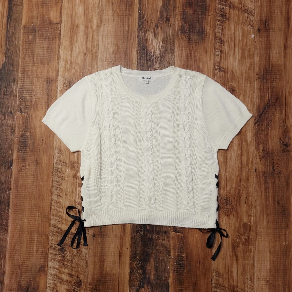- 美品 デュカ Dukkah サイドレースアップセーター レディース 半袖 リボン ショート丈 フリーサイズ オフホワイト LH65