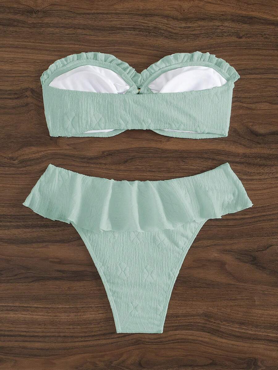 - レディース 水着 ビキニセット 女性用無地のビキニセット、ブリーフに接続された円形のトリムが付いたバンドゥトップ、ルフルディテール