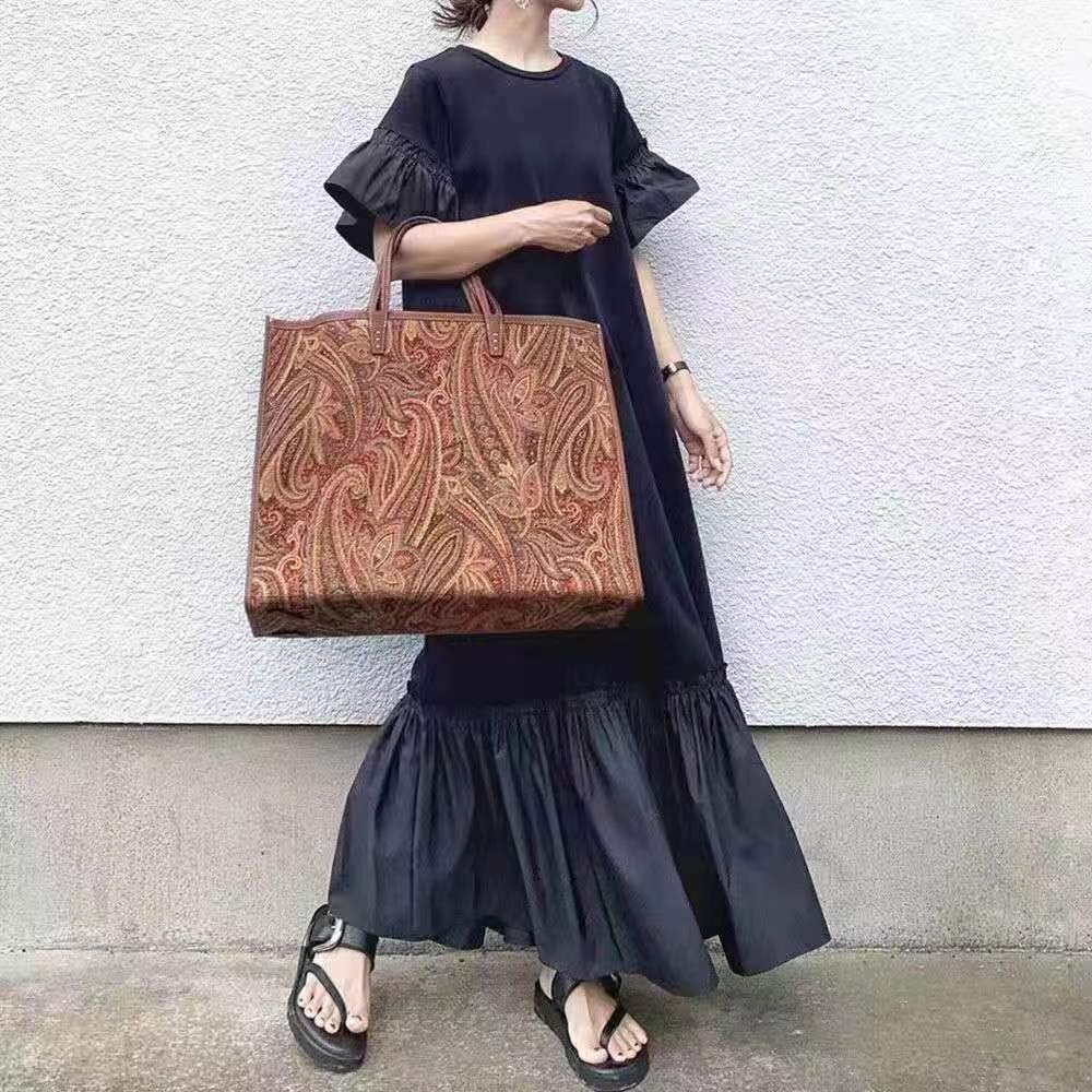 - LRM1479★新品お袖と裾が異素材でとってもおしゃれ 大きいサイズもOKなフリーサイズ TEE素材のマキシ丈ワンピ