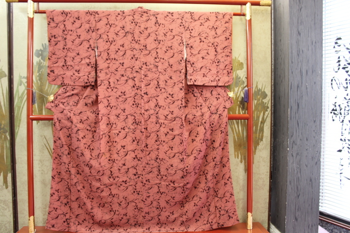 > きもの今昔7073 小紋のきもの バチ衿袷手縫い仕立 洗い張り染め直しと判断 ローズ色に墨の濡れ描き 身丈154CM